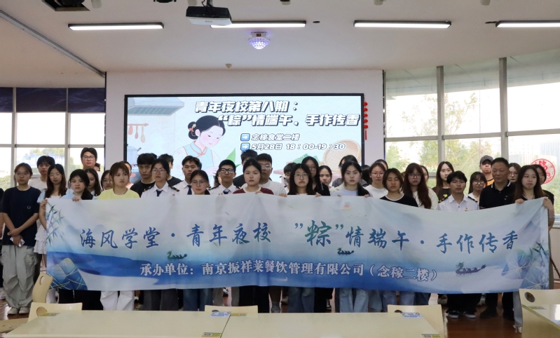 粽叶飘香,糯米晶莹,一根麻绳串起千年文化的温度。5月28日晚,由校团委和南京振祥莱餐饮管理有限公司联合举办的“海风学堂·青年夜校”第八期—“‘粽’情端午,手作传香”主题活动在念稼餐厅二楼温馨举办。50名同学齐聚一堂,在粽叶的清香中感受传统文化的魅力,用双手编织属于青春的端午记忆。