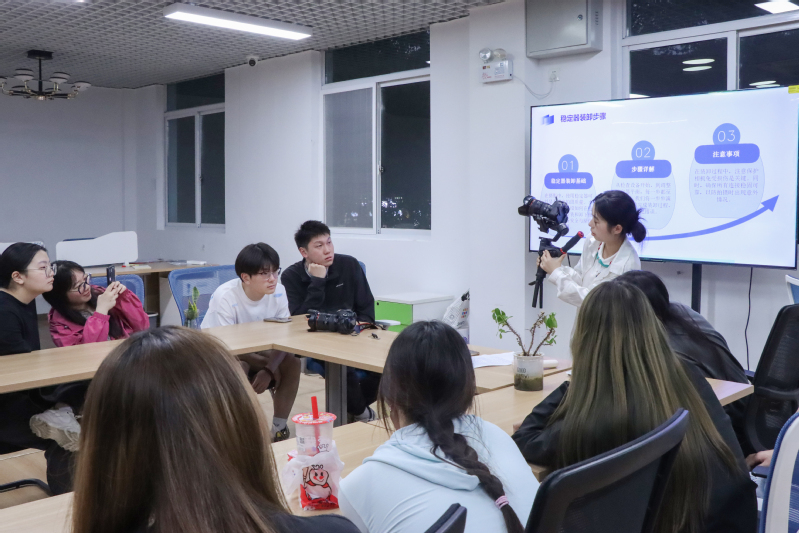 在拍摄技巧教学环节,主讲老师以风景与人像为例,详细演示了参数设置、构图美学、对焦技艺及虚化控制。现场讲解与实操相结合,让同学们从取景到按下快门,都能体会捕捉瞬间美的奥秘。随后,老师分步演示了稳定器的上手操作,帮助同学们掌握平稳拍摄的技巧,让更多灵感在镜头中自由流淌。
