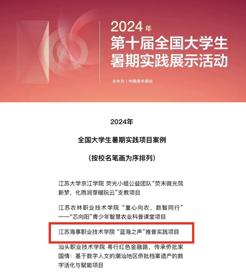 近日,由共青团中央指导,中国青年报主办的“2024年第十届全国大学生暑期实践展示活动”案例评选结果揭晓,经校方推荐、团队自荐、网络展示等环节,共遴选出100个暑期实践团队案例、100个暑期实践项目案例和100个暑期实践成果案例。我校“蓝海之声”实践项目成功入选2024年全国大学生暑期实践百强项目案例!